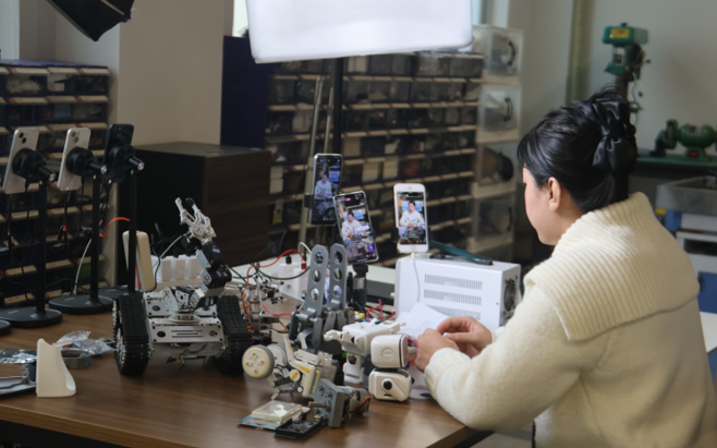 杭州萧山XPACE湾区数字公园的一间责任室里,早上九点多依然忙开了。一个女生坐在堆满器材的桌前,对着眼前七八台手机,开动直播授课。她的死后是一台半制品的轮式机器东谈主,绕过它,十二张责任台排开,键盘声噼里啪啦,几个年青东谈主正埋头在电脑前捣饱读着什么。