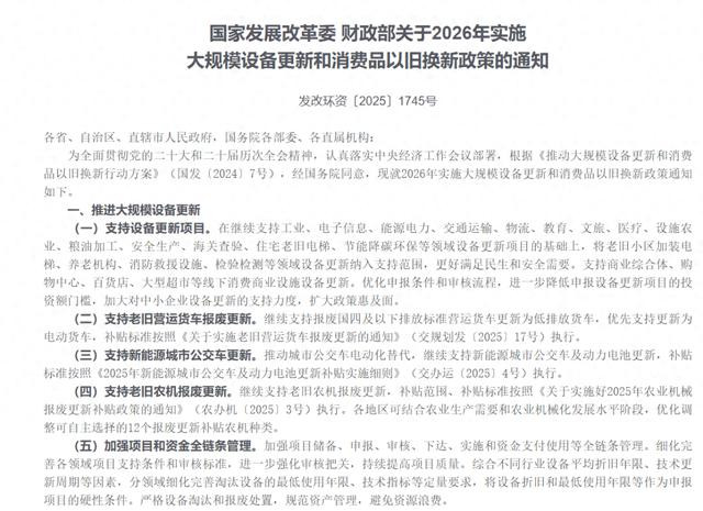 国度发展矫正委、财政部印发的《对于2026年引申大界限诞生更新和破钞品以旧换新战略的奉告》30日对外发布,明确2026年“两新”战略的支柱范围、补贴尺度和责任条目。